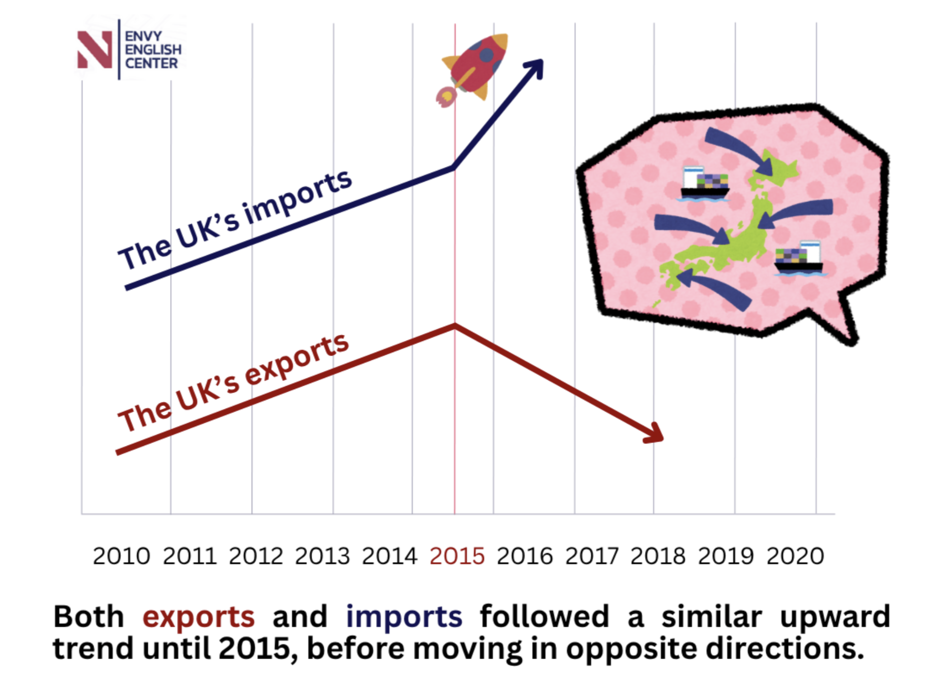 E.g. Both exports and imports followed similar upward trends until 2015, before moving in opposite directions.