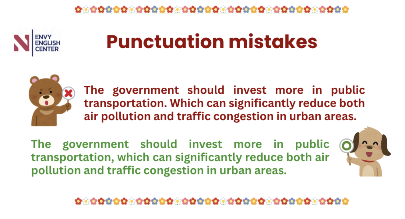 Mệnh đề phụ không thể đứng độc lập, nên cần dấu phẩy chứ không phải dấu chấm. Lỗi này thể hiện sự thiếu kiểm soát về sentence structure và cho thấy thí sinh có một lỗ hỏng cơ bản trong nền tảng lý thuyết ngữ pháp.