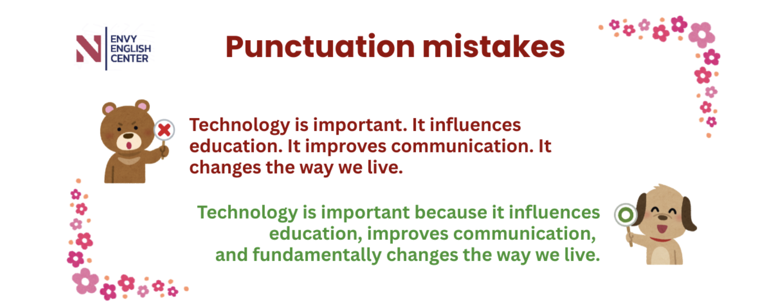 Việc ngắt câu quá thường xuyên khiến bài viết nghe như một chuỗi câu đơn, thiếu tính học thuật. Ví dụ như ở đây, việc liên kết các mệnh đề lại bằng liên từ, hình thành nên một câu Complex sentence ngay lập tức khiến câu văn trở nên tự nhiên và “có flow” hơn.