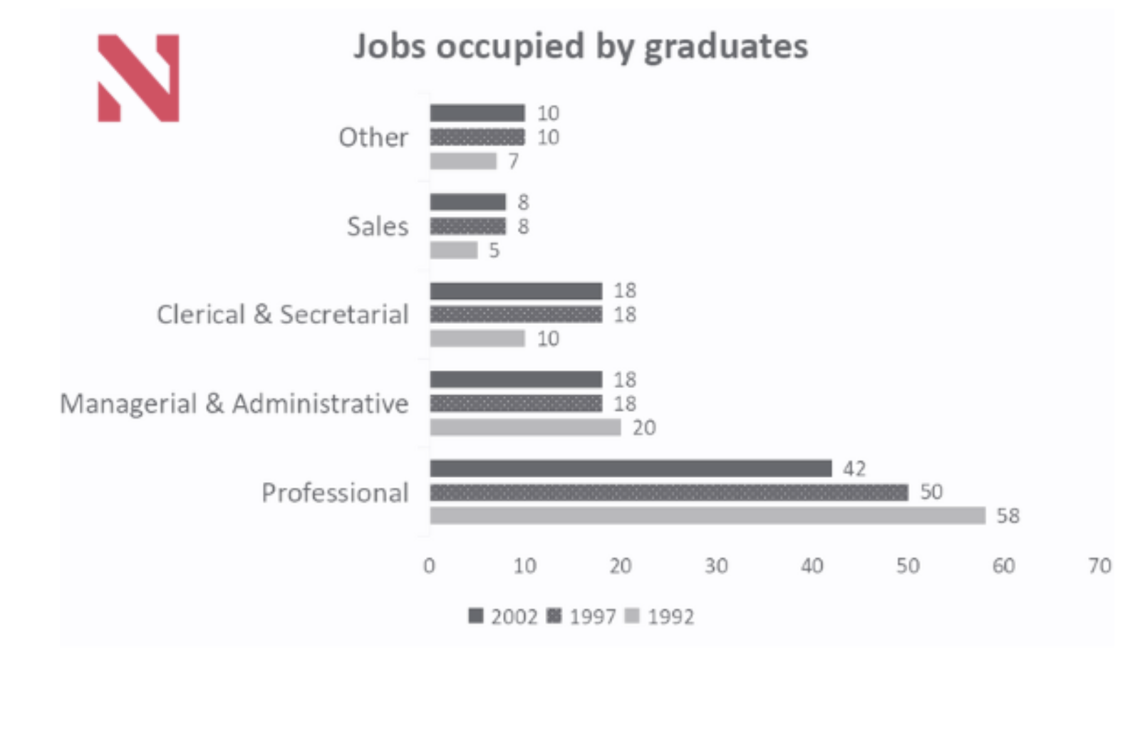 Thay vì viết “A makes up 52%”, hãy viết “A accounts for over half of the overall figure.” Thay vì viết “B comprises 25.2%”, hãy viết “B constitutes over ¼ of the overall figure.”
