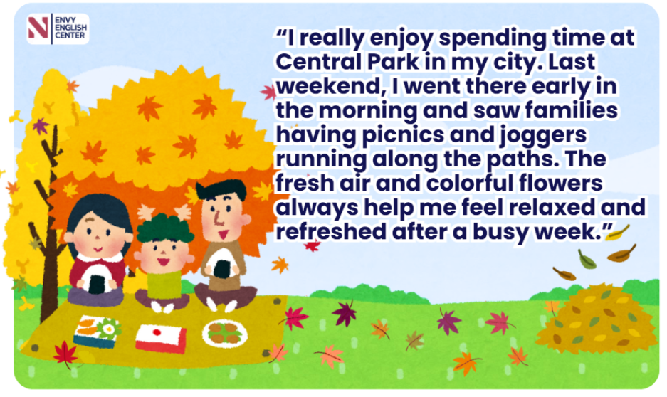 “Well… I like this park because it’s big and has trees and flowers and… uh… people come here to walk and jog and… sometimes I go there with friends…”