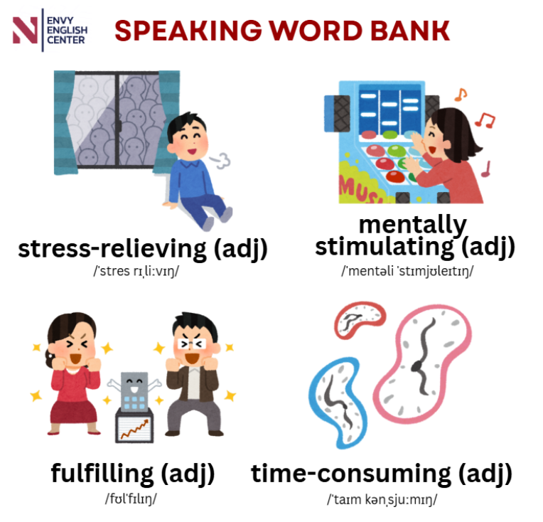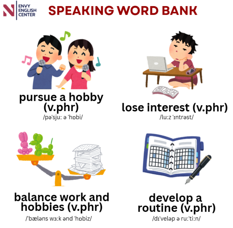 balance work and hobbies (v.phr): cân bằng công việc & sở thích