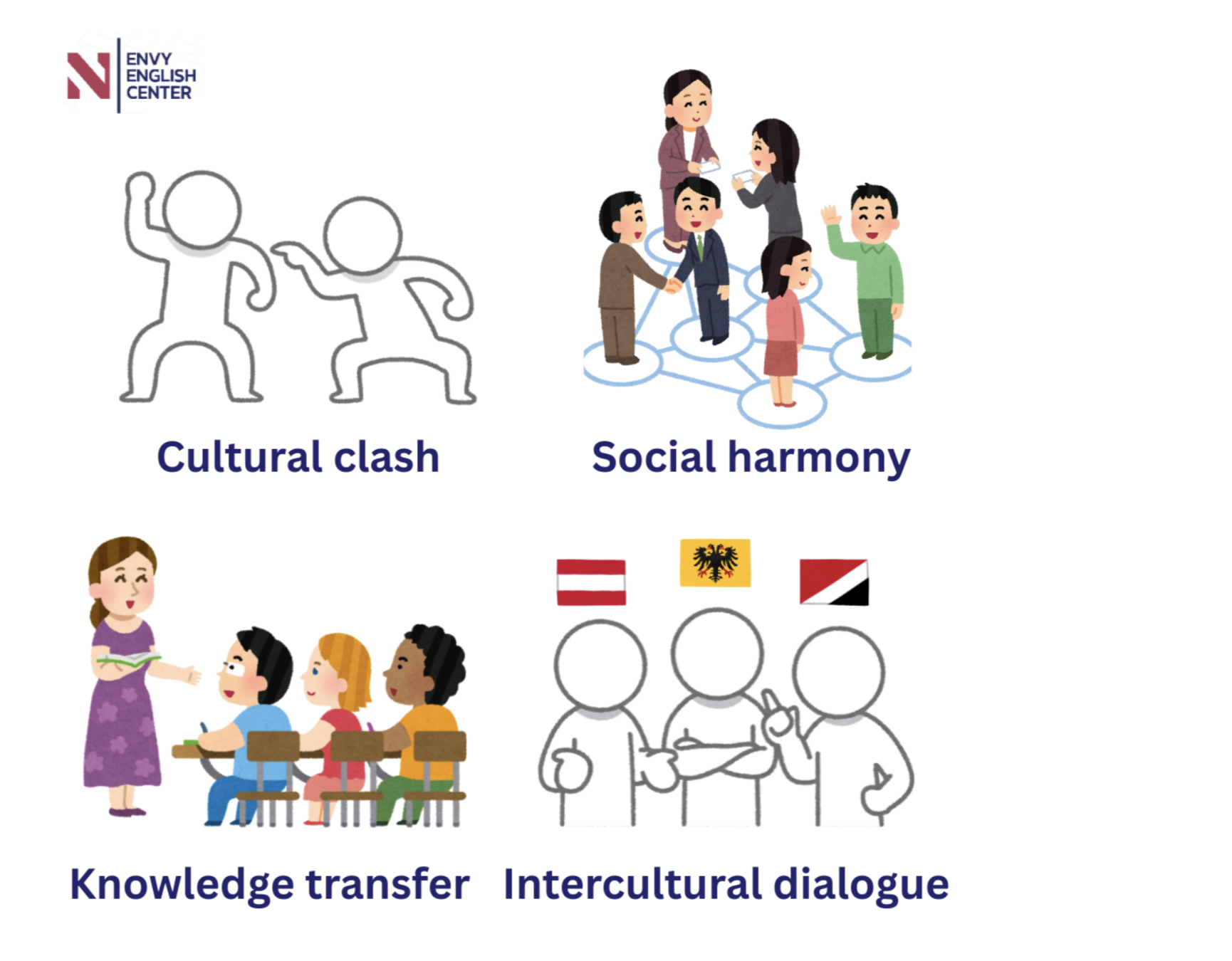 E.g. Intercultural dialogue helps reduce misunderstandings.