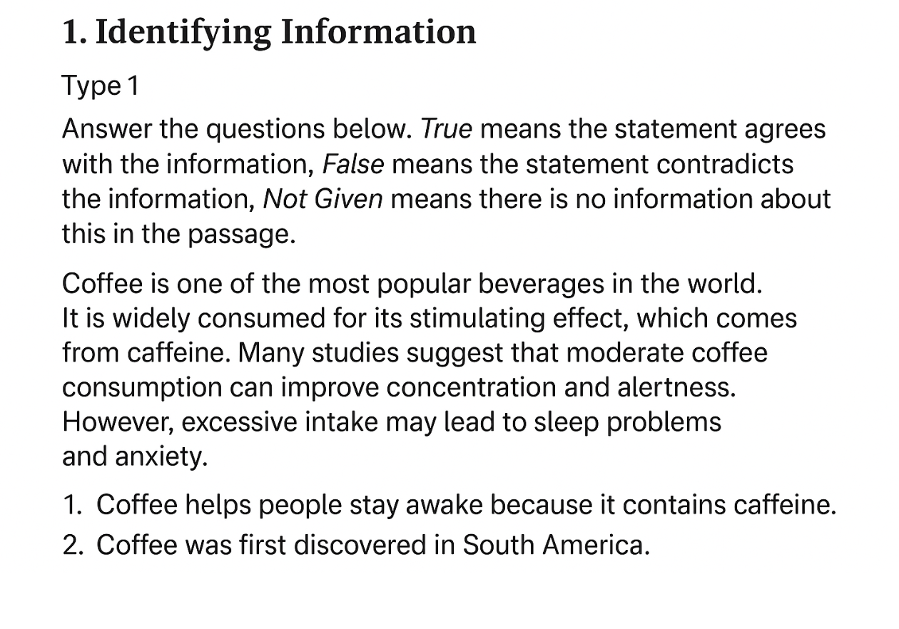 Câu 1: Đoạn văn có nói đến “stimulating effect… from caffeine” → khớp với thông tin trong câu hỏi. Đáp án: True.