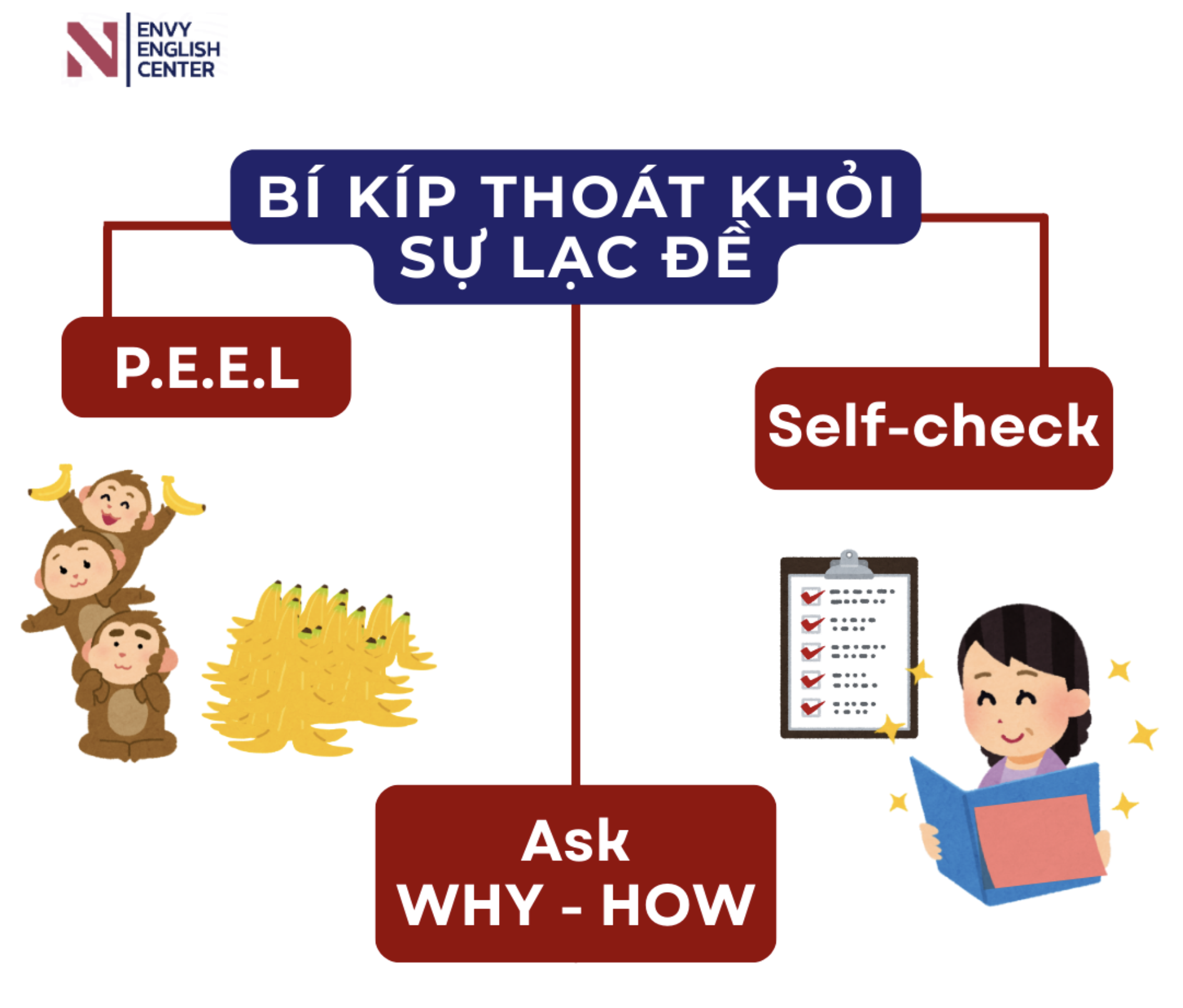 P.E.E.L luôn là phương pháp đáng tin cậy, được sử dụng rộng rãi. Áp dụng thuần thục biện pháp này sẽ giúp 90% trường hợp lạc đề trở về đúng định hướng.