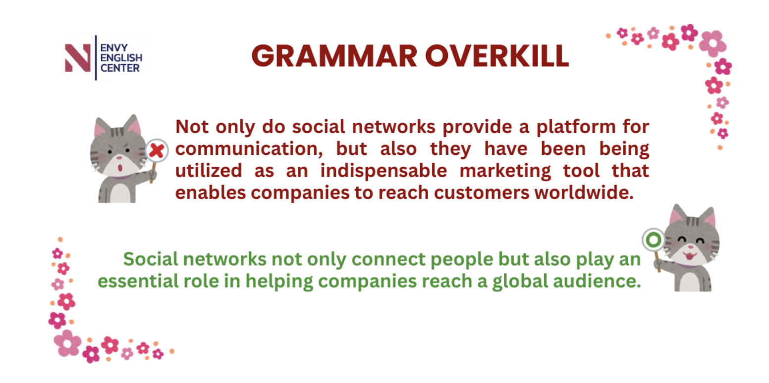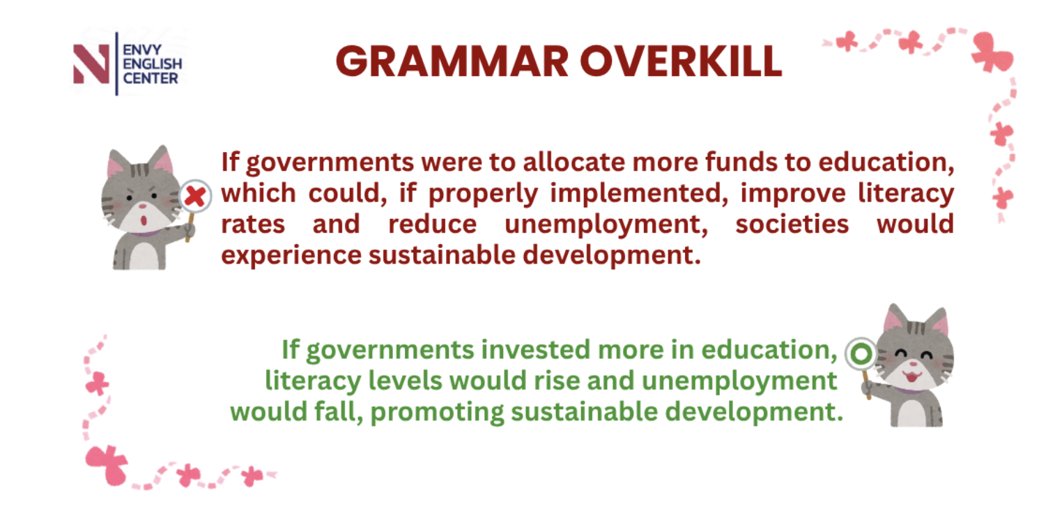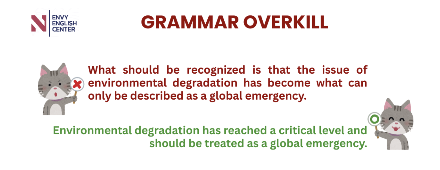 Hiểu đơn giản, Grammar Overkill là khi bạn “ép” bài viết phải dùng một lúc thật nhiều cấu trúc ngữ pháp phức tạp (như inversion, complex sentences, conditional clauses, nominal clauses,…) trong khi chưa nắm chắc được nền tảng lý thuyết, khiến câu văn vô hình chung trở nên nặng nề, thiếu mạch lạc, và trong đa số trường hợp, thậm chí còn dẫn đến việc mắc nhiều lỗi nghiêm trọng.