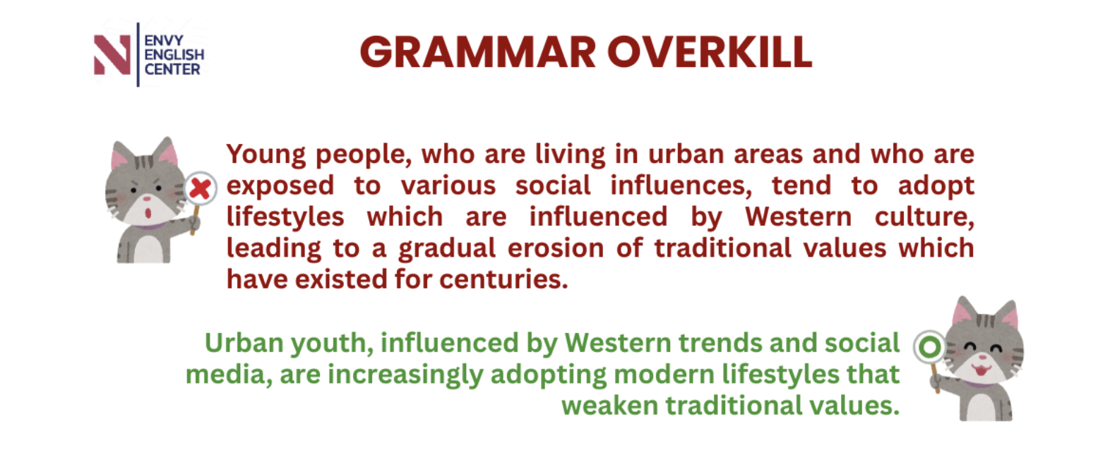Tương tự như việc lạm dụng ngôn từ “cao siêu”, grammar overkill khiến bài viết của bạn nghe thì có vẻ “band 9” nhưng thực ra… giám khảo chỉ thấy mệt. Đơn giản, rõ ràng, và mạch lạc - đúng tinh thần “high accuracy over high complexity” - thà đơn giản mà chính xác còn hơn phức tạp nhưng rối rắm và đầy lỗi sai.