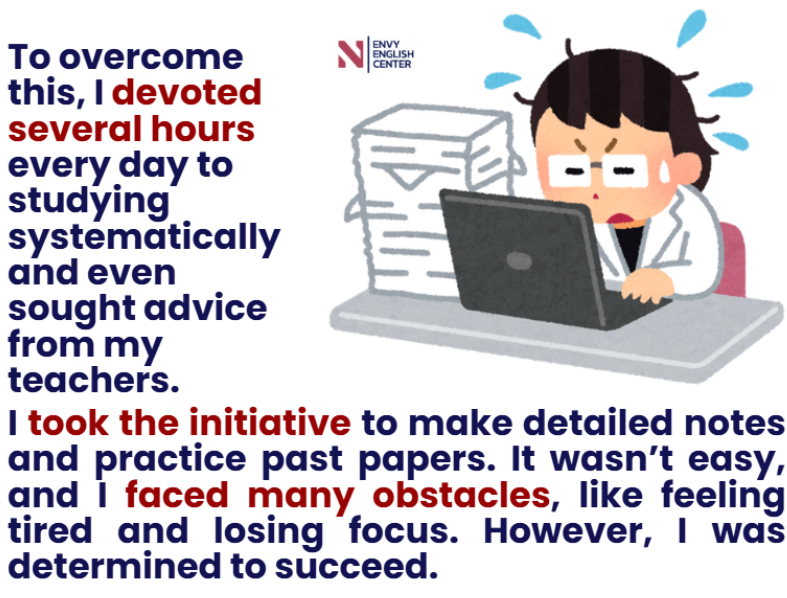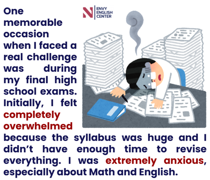 "One memorable occasion when I faced a real challenge was during my final high school exams. Initially, I felt completely overwhelmed because the syllabus was huge and I didn’t have enough time to revise everything. I was extremely anxious, especially about Math and English. To overcome this, I devoted several hours every day to studying systematically and even sought advice from my teachers. I took the initiative to make detailed notes and practice past papers. It wasn’t easy, and I faced many obstacles, like feeling tired and losing focus. However, I was determined to succeed. Eventually, my hard work paid off, and I passed my exams with excellent results. I felt proud and relieved, and this experience taught me the importance of perseverance and time management."