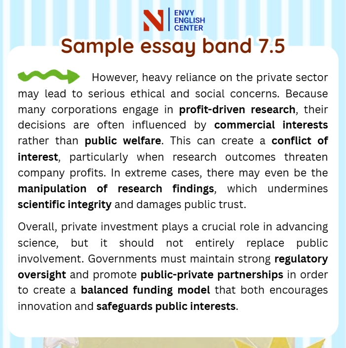 However, heavy reliance on the private sector may lead to serious ethical and social concerns. Because many corporations engage in profit-driven research, their decisions are often influenced by commercial interests rather than public welfare. This can create a conflict of interest, particularly when research outcomes threaten company profits. In extreme cases, there may even be the manipulation of research findings, which undermines scientific integrity and damages public trust.
