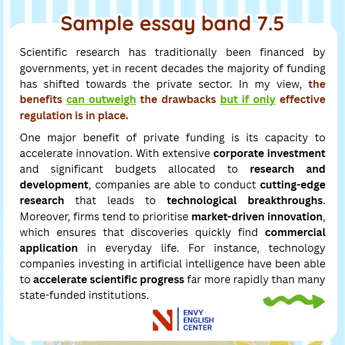 e.g: modern scientific progress increasingly depends on private sector funding, particularly in industries where governments are reluctant to provide sufficient research grants. large corporations often allocate significant budgets to research and development, ensuring continuous technological progress. without such financial backing, many innovative projects would struggle to move beyond theoretical stages.