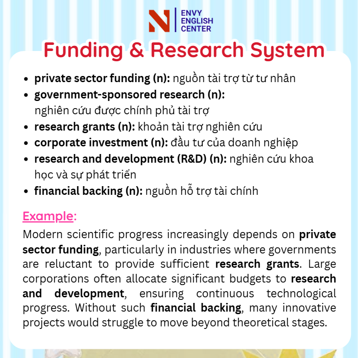 research and development (r&d) (n): nghiên cứu khoa học và sự phát triển